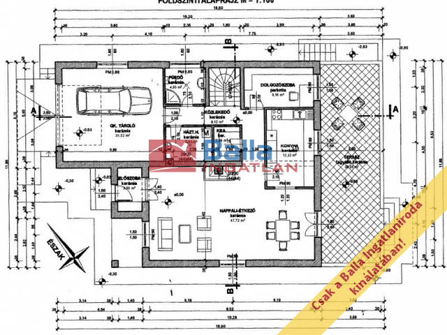 földszinten egy 47,42 m²-es nappali–étkező, valamint egy külön dolgozó (9,18 m²)