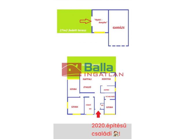 Egyéb tulajdonságok: tehermentes, azonnal költözhető, terasz (60 m²), kamra, külön wc, garázs, zárt autóbeálló