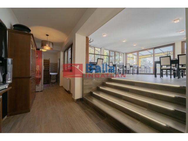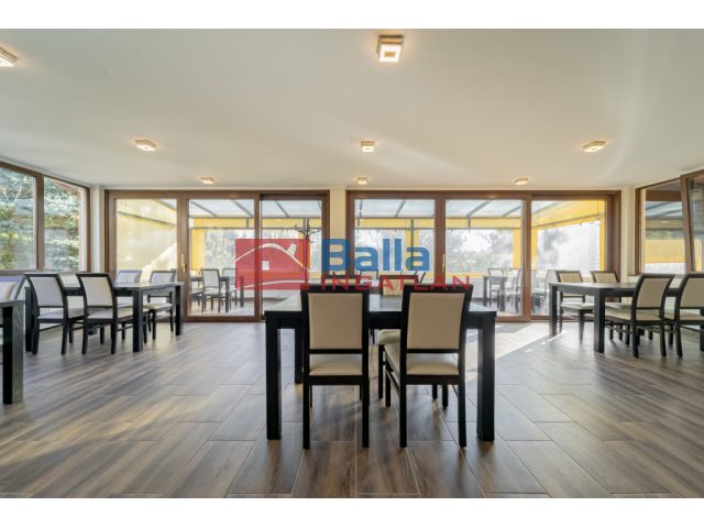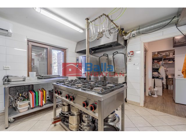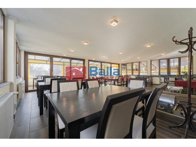 Étteremhez középső szint, tartozik 157,8m2 kiszolgálótér teljes berendezés (asztalok, székek, bárpult). Konyha, raktár, előtér, gépészeti tér, dolgozói és vendég mellékhelységek 91,67m2 területen. A konyhai gépek a legmodernebben (RATIONAL sütő-főző, hűtött pult, hűtő szekrények stb.), de nem tartoznak az alap vételárba az étterem és az apartmanok mobiliáival együtt, külön vételi megállapodás részét képezhetik.