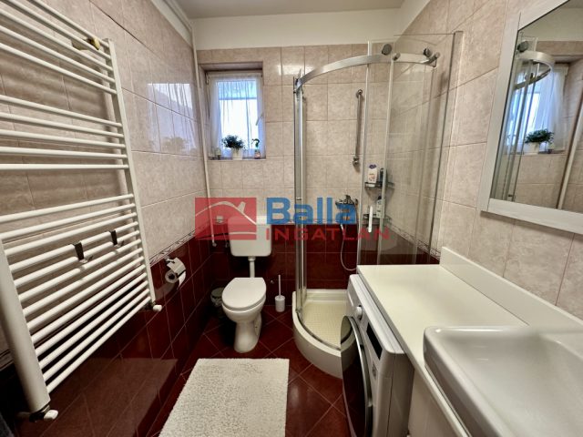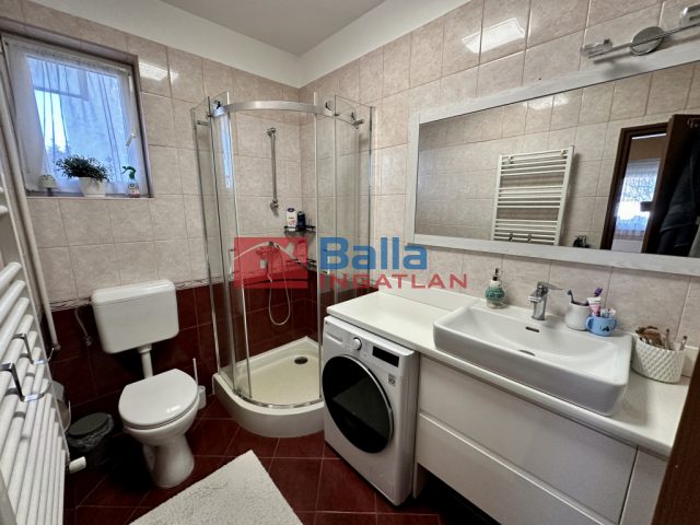 - Földszinti fürdőszoba: Zuhanykabinnal, WC-vel és mosógéppel felszerelt.